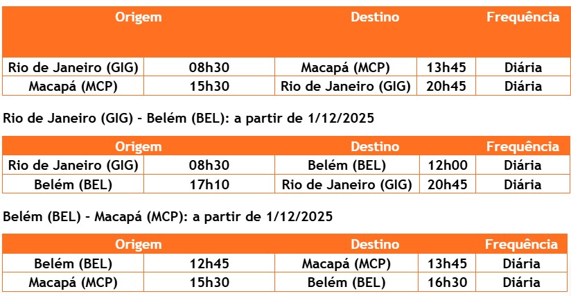 Rio de Janeiro (GIG) – Macapá (MCP): a partir de 1/12/2025 – Escala em Belém