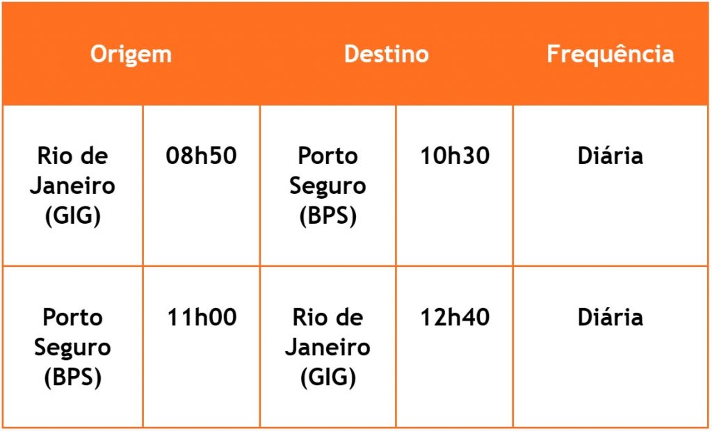 No último dia 4 de agosto, a GOL iniciou seus voos regulares, diretos e diários para Porto Seguro (BPS) a partir de GIG, permitindo aos Clientes o acesso rápido e cômodo às paisagens paradisíacas do litoral sul da Bahia, como as de Arraial d’Ajuda, Santa Cruz Cabrália, Caraíva, Trancoso e Praia do Espelho, entre outros. Com o lançamento do novo destino, são 32 opções domésticas e internacionais à disposição dos passageiros na capital fluminense, atendidas sem escalas pela Companhia [veja tabela abaixo com frequências e horários dos voos para Porto Seguro].